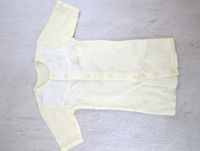 ゾウさんプリントがかわいいカバーオールです。タグのサイズ表記は50-60です。少し毛玉が出始めているので、星2つ判定としております。