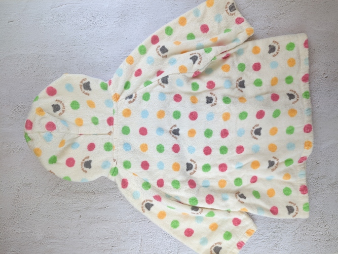 柔らかいベージュ色がベースのMIKI HOUSEのパーカーです。タオル地でゆったり目のサイズ感です。サイズ表記が無いのでMIKI HOUSE FIRST(新生児から2歳くらいまでのブランドライン)と採寸結果から判断し、新生児~90cmくらいまでと判断しました。
