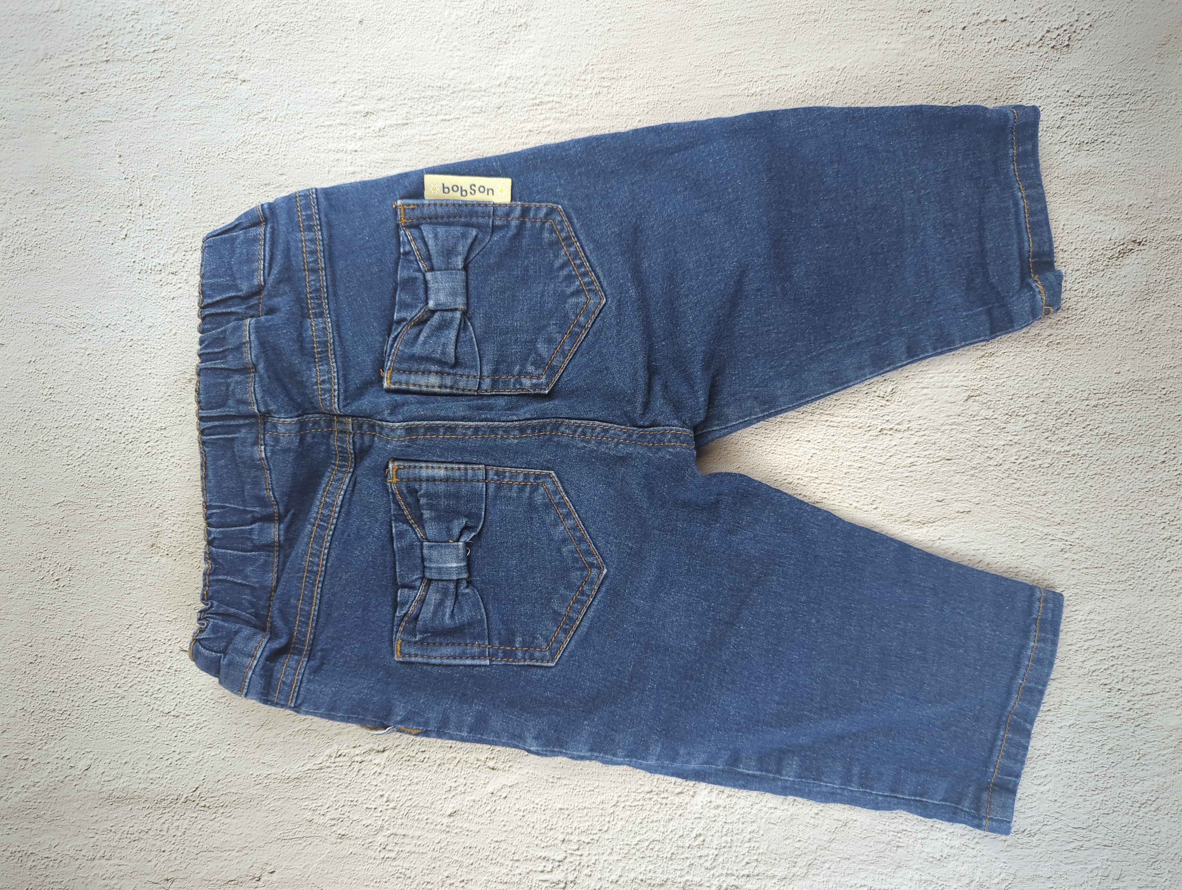 リボンがかわいいBobsonのデニムパンツです。生地は薄手、サイズ表記は95です。