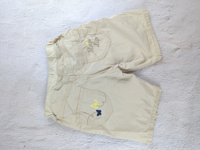 ポケットの刺繍がかわいショートパンツです。薄いチノパンっぽい生地感です。